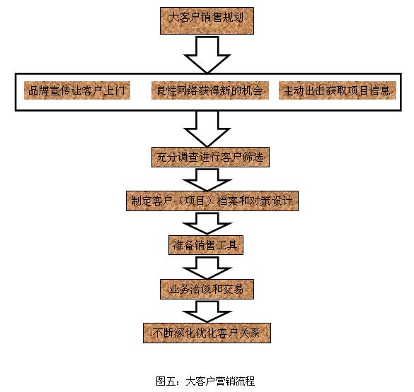 大客戶是指直接大型用戶,從北恩產(chǎn)品的用戶群體來看涉及的行業(yè)較多和用戶較復(fù)雜,如果全面突擊必會導(dǎo)致公司資源的分散和精力分配不足。面對激烈的競爭,必須根據(jù)產(chǎn)品特色和各細(xì)分市場的特征,確定我們的目標(biāo)市場才能找到核心大客戶,建立在此市場的絕對優(yōu)勢地位,方能在全國市場擁有一席之地。根據(jù)北恩電聲未來發(fā)展趨勢,大客戶是北恩電聲爭奪的制高點,只有占領(lǐng)制高點才能掌握主動。(見圖五)