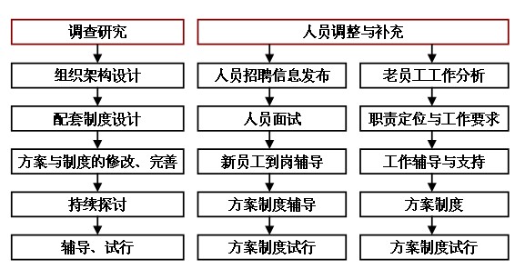 針對(duì)生元集團(tuán)內(nèi)部管控?zé)o力,人才缺乏、團(tuán)隊(duì)效能低下的現(xiàn)狀,南方略項(xiàng)目組進(jìn)入項(xiàng)目伊始便采取了管控機(jī)制、制度、流程梳理與內(nèi)部團(tuán)隊(duì)建設(shè)〝兩手抓〞〝兩步走〞的策略方針,具體為內(nèi)部管控機(jī)制上:開展深入、全面的內(nèi)部調(diào)查研究→組織架構(gòu)的重新設(shè)計(jì)→管控機(jī)制、配套制度的建立→方案制度的試行修改,團(tuán)隊(duì)建設(shè)上:人才的引進(jìn)、老員工的工作分析及崗位確定→職責(zé)定位、工作要求→工作輔導(dǎo)與支持→管控制度的試行