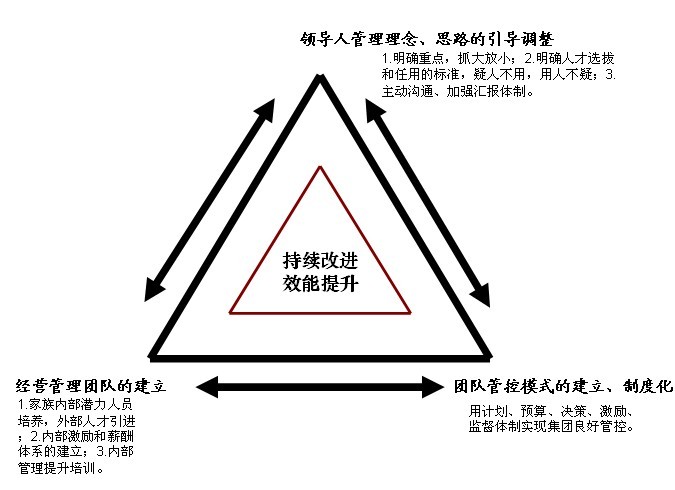 ▲企業(yè)文化打造、集團(tuán)管控模式建立、高效團(tuán)隊(duì)打造〝鐵三角〞對(duì)策〔見圖二〕