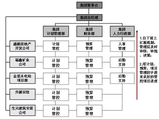 2、重新設(shè)計(jì)集團(tuán)的組織架構(gòu)并運(yùn)用計(jì)劃、預(yù)算、決策、項(xiàng)目管理機(jī)制的有效杠桿實(shí)現(xiàn)集團(tuán)的有力管控: