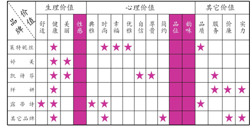 南方略發(fā)現(xiàn),調(diào)整型內(nèi)衣行業(yè)的產(chǎn)品屬性同質(zhì)化現(xiàn)象嚴重,各品牌都開始在概念上下功夫。同時,品牌價值訴求也存在嚴重的同質(zhì)化現(xiàn)象,多數(shù)企業(yè)都在吆喝自己的調(diào)整型內(nèi)衣產(chǎn)品的“健康”與“時尚”,至于“性感”、“品位”、“韻味”等概念則鮮有涉及。同時,市場中不乏染指“東方”的概念,與衣馨的“東方女性形體顧問”類似,但卻缺乏真正將其表現(xiàn)到位的品牌…… (圖5)