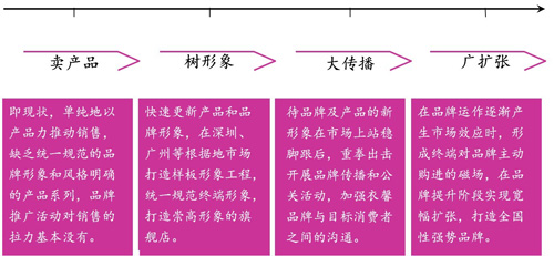 為了配合實現(xiàn)成為區(qū)域知名品牌的近期目標,及行業(yè)領(lǐng)導(dǎo)型品牌的長期目標,南方略為衣馨描畫的是這樣的一條路徑(圖9),即是:以產(chǎn)品品質(zhì)為驅(qū)動,重新塑造別具特色的品牌形象,再針對品牌的個性和核心價值進行多層次、全方位的整合營銷傳播,建立起衣馨品牌在目標消費者心智中的獨特占位,穩(wěn)固推進終端零售網(wǎng)點的擴張以及品牌戰(zhàn)略的穩(wěn)固向前,最終實現(xiàn)品牌的可持續(xù)發(fā)展。