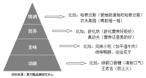 如上圖所示,這可以說是馬斯洛需求層次理論在食品行業(yè)中的實(shí)踐版。從消費(fèi)者需求層次層面來劃分的話,食品的價(jià)值屬性由低到高可歸結(jié)為四類:功能、美味、營養(yǎng)和情調(diào)。