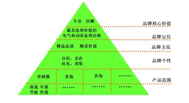 南方略認(rèn)為要解決這兩大難題,唯有實(shí)施品牌差異化運(yùn)作。而英威騰的品牌差異化之路,應(yīng)從多方面進(jìn)行全方位提升,即品牌定位、品牌特征、品牌設(shè)計(jì)表現(xiàn)、品牌傳播、品牌管理。按照這一思路,結(jié)合南方略獨(dú)創(chuàng)的品牌構(gòu)建金字塔模型,南方略創(chuàng)建了英威騰品牌金字塔,具體如下圖所示: