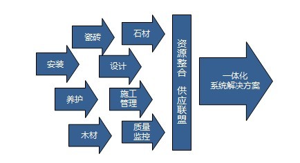 通過外部資源整合、供應(yīng)端口的戰(zhàn)略聯(lián)盟,將客戶所需要的資源以最終裝飾效果為目標(biāo)呈現(xiàn)在客戶面前,形成系統(tǒng)方案,真正為客戶提供一條龍式的整合服務(wù)。