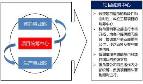在組織上,環(huán)球之前的項目經(jīng)理模式的運作對于營銷的支持不足,也無法實現(xiàn)項目制運作的基本要求;同時項目經(jīng)理被設(shè)置在生產(chǎn)部門,受到生產(chǎn)的制約,無法發(fā)揮項目經(jīng)理應(yīng)有的統(tǒng)籌作用。因此,南方略顧問團隊為環(huán)球石材設(shè)立了獨立的項目統(tǒng)籌中心,實現(xiàn)各業(yè)務(wù)大區(qū),營銷、項目、生產(chǎn)的三大平行職能。