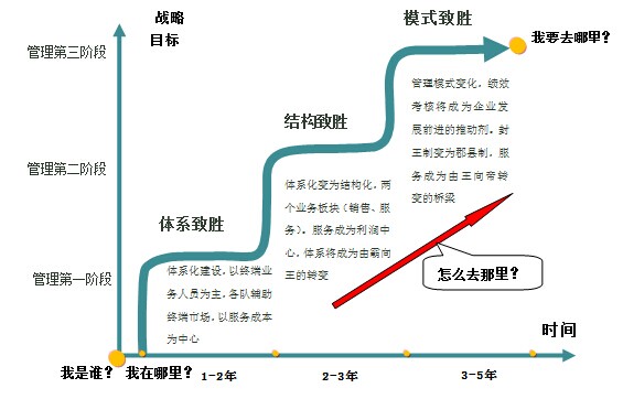 項(xiàng)目組提出:針對(duì)CC北方片區(qū)市場(chǎng)的實(shí)際情況和企業(yè)管理情況,營(yíng)銷戰(zhàn)略要按三步走:體系制勝-結(jié)構(gòu)制勝-模式制勝。首先,應(yīng)該將市場(chǎng)由不可控變?yōu)榭煽?,那就只能依靠體系的力量,把依托人(包括業(yè)務(wù)員和渠道渠道網(wǎng)絡(luò))轉(zhuǎn)變?yōu)橐劳畜w系,市場(chǎng)先抓到公司手中;其次,在可控的基礎(chǔ)上,通過業(yè)務(wù)模式的變化,將細(xì)分市場(chǎng),實(shí)現(xiàn)銷售、服務(wù)三個(gè)板塊或者三種業(yè)務(wù)模式將客戶和市場(chǎng)拆分,增強(qiáng)企業(yè)的抗風(fēng)險(xiǎn)性和彼此制衡,實(shí)現(xiàn)服務(wù)滲透客戶;最后,通過管理的變革,績(jī)效導(dǎo)向,實(shí)現(xiàn)各個(gè)利潤(rùn)中心起頭并進(jìn),體系的力量最大化。