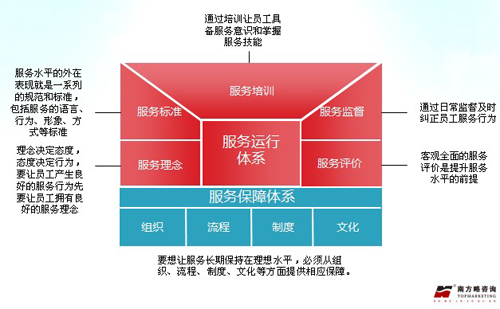 服務(wù)體系包含兩大部分:一是直接與服務(wù)過程相關(guān)的服務(wù)運行體系,二是為服務(wù)運行提供保障的服務(wù)保障體系。目前后勤服務(wù)行業(yè)還處于粗放管理階段,海泰要打造新的品牌形象就必須對服務(wù)理念和服務(wù)標(biāo)準(zhǔn)進行升級,把服務(wù)培訓(xùn)納入日常經(jīng)營活動中,使陽光海泰的服務(wù)活動形成具有理念、標(biāo)準(zhǔn)、培訓(xùn)、監(jiān)督和評價在內(nèi)的一個完整體系,并從組織、流程、制度、文化的角度為服務(wù)運行提供相關(guān)保障。