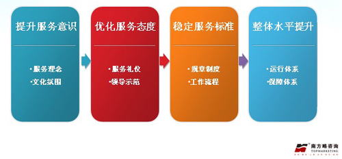 俗話說:“羅馬不是一天建成的”。要樹立嶄新的品牌形象、打造優(yōu)秀的服務(wù)體系也非朝夕之功,海泰必須遵循客觀規(guī)律循序漸進。根據(jù)海泰的實際情況,南方略提出了服務(wù)體系建設(shè)四步曲:
