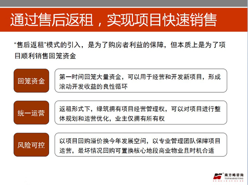 3、項(xiàng)目的商業(yè)產(chǎn)品,體量3萬(wàn)余方,在三四級(jí)城市可謂不大不小,但萬(wàn)州整體商業(yè)市場(chǎng)已被前期進(jìn)入市場(chǎng)的萬(wàn)達(dá)金街、其它樓盤項(xiàng)目底商所擠壓,而且區(qū)域內(nèi)不論是居住人口還是社區(qū)底商的開(kāi)業(yè)率都非常低,現(xiàn)在進(jìn)入,只能享受價(jià)值升值空間,短期內(nèi)難以獲得穩(wěn)定收入,因此,項(xiàng)目組經(jīng)過(guò)深思熟慮,提出“售后返租“或“租售結(jié)合”的復(fù)合營(yíng)銷模式。“售后返租“模式的引入,本質(zhì)上還是為了項(xiàng)目順利銷售回籠資金。