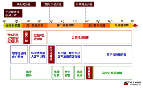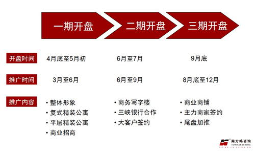 又根據(jù)時(shí)間規(guī)劃,建議項(xiàng)目分為三期推盤,并對(duì)每次推盤的時(shí)間,宣傳推廣時(shí)間及推廣內(nèi)容做了明確的規(guī)劃及部署。