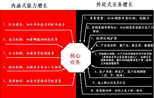 企業(yè)增長其主要途徑是圍繞核心業(yè)務(wù)展開的內(nèi)涵式能力增長與外延式業(yè)務(wù)增長。內(nèi)涵式能力增長能通過培養(yǎng)企業(yè)核心競(jìng)爭力和運(yùn)作能力,獲得長期競(jìng)爭優(yōu)勢(shì);外延式業(yè)務(wù)增長能實(shí)現(xiàn)業(yè)務(wù)的跳躍式成長,在短期內(nèi)改變業(yè)務(wù)單元在其所在領(lǐng)域的競(jìng)爭地位,此二者相輔相成,相互支持。戰(zhàn)略增長模型如下: