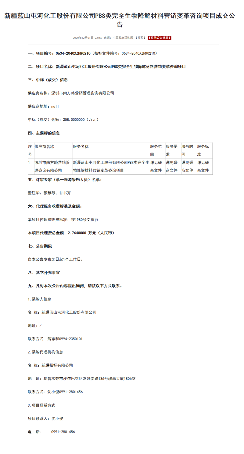 中標(biāo)!南方略營銷管理咨詢集團(tuán)中標(biāo)新疆藍(lán)山屯河化工股份有限公司PBS類完全生物降解材料營銷變革咨詢項(xiàng)目,中標(biāo)金額:258萬元!