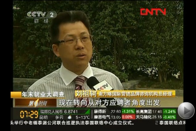 12月12日,CCTV-2財(cái)經(jīng)頻道“第一時(shí)間”對(duì)劉祖軻進(jìn)行了專題訪談:《招工難引發(fā)招聘方式的四大轉(zhuǎn)變》