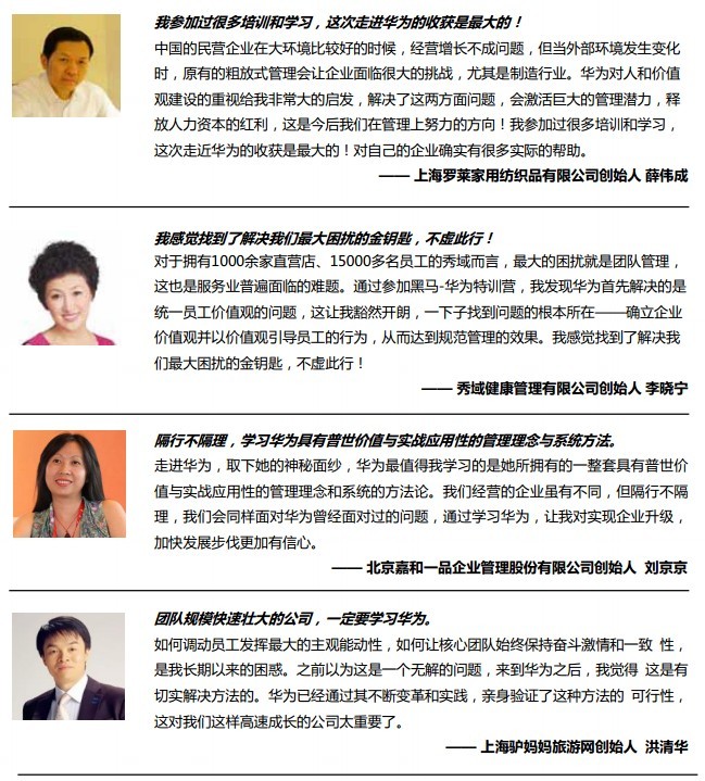 4.有志于將企業(yè)打造成為像華為一樣具有國際競爭力的企業(yè)領(lǐng)袖與高管。