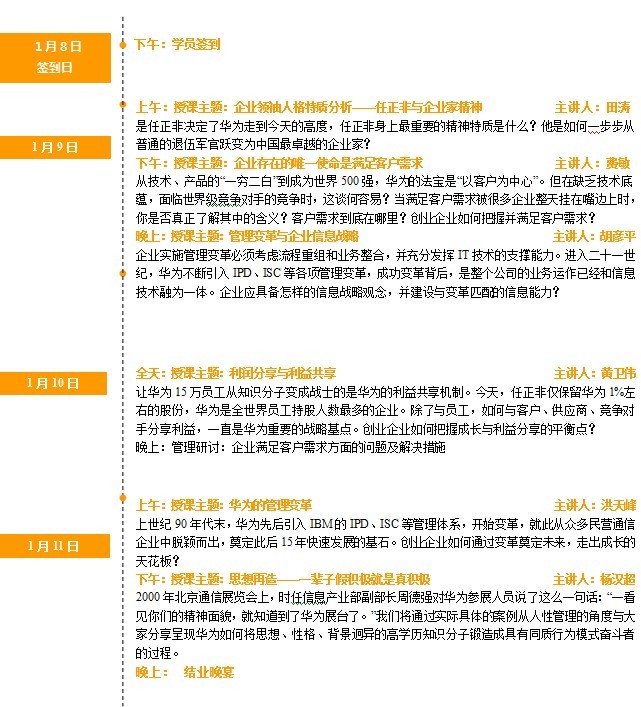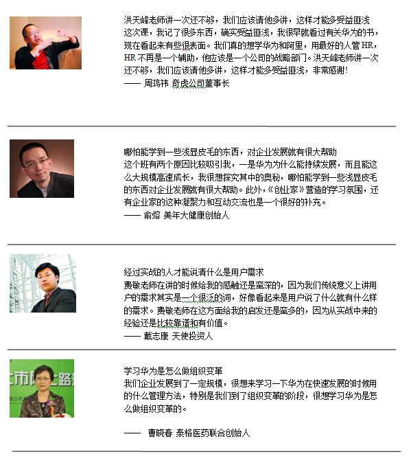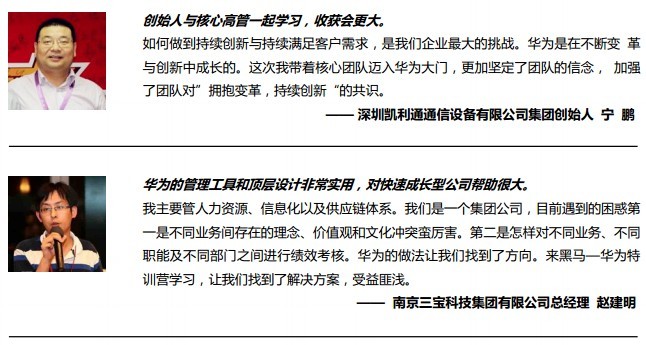 在黑馬—華為特訓(xùn)營(創(chuàng)始人班),我們將追隨幾位先生,學(xué)習(xí)體驗華為的成長經(jīng)歷、審視我們的創(chuàng)業(yè)模式,經(jīng)驗也許不能復(fù)制,但一定能夠給你啟迪。