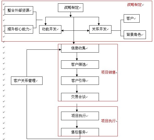 項(xiàng)目營銷所面臨的每個項(xiàng)目都有其獨(dú)特性和復(fù)雜性,同時(shí),項(xiàng)目中還面臨與客戶在經(jīng)濟(jì)關(guān)系上的非連續(xù)性的特點(diǎn)。項(xiàng)目營銷的目的不是就項(xiàng)目而論項(xiàng)目,單純地把握和跟進(jìn)某一項(xiàng)目業(yè)務(wù)機(jī)會,而是要企業(yè)結(jié)合營銷環(huán)境正確制定公司的戰(zhàn)略目標(biāo),并通過項(xiàng)目營銷管理,在相應(yīng)的目標(biāo)市場內(nèi)準(zhǔn)確的自我定位,拓展與目標(biāo)客戶的連續(xù)性關(guān)系,以便能更好的預(yù)測未來和更好的控制局面,以保持領(lǐng)先于競爭對手。下面,給出了項(xiàng)目營銷管理的流程: